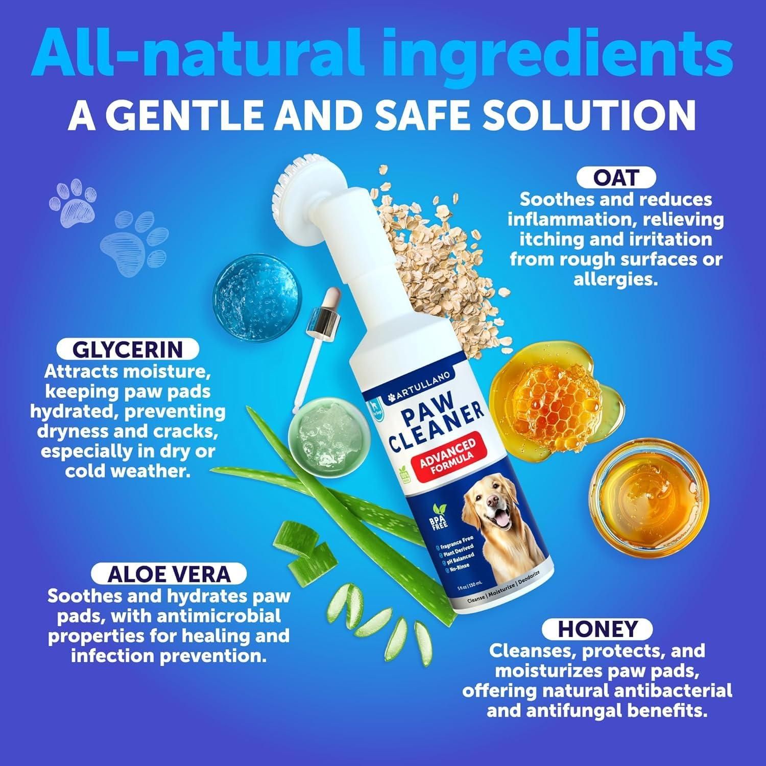 3.natural ingredients: crafted with the safety and care of your pet in mind, this paw cleaner for dogs incorporates plant-derived ingredients like aloe vera and oat extracts. perfect for maintaining the natural beauty and hygiene of your dogs paws